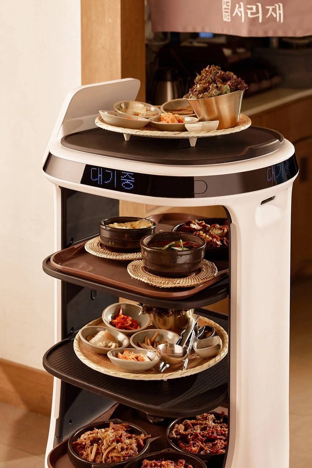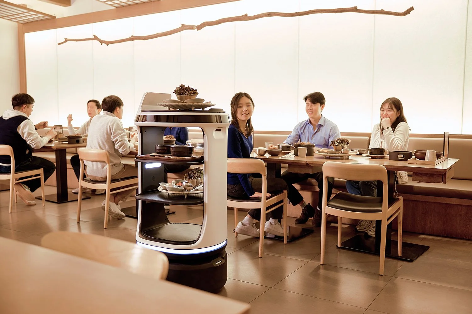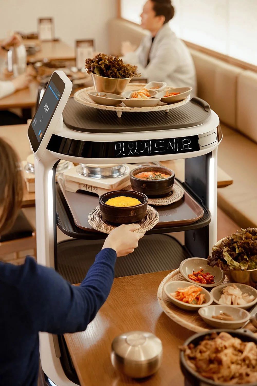 Striking LED lighting enhances visibility and communication. The pillar light shows customers where their food is located as the robot delivers it to the table.